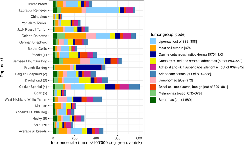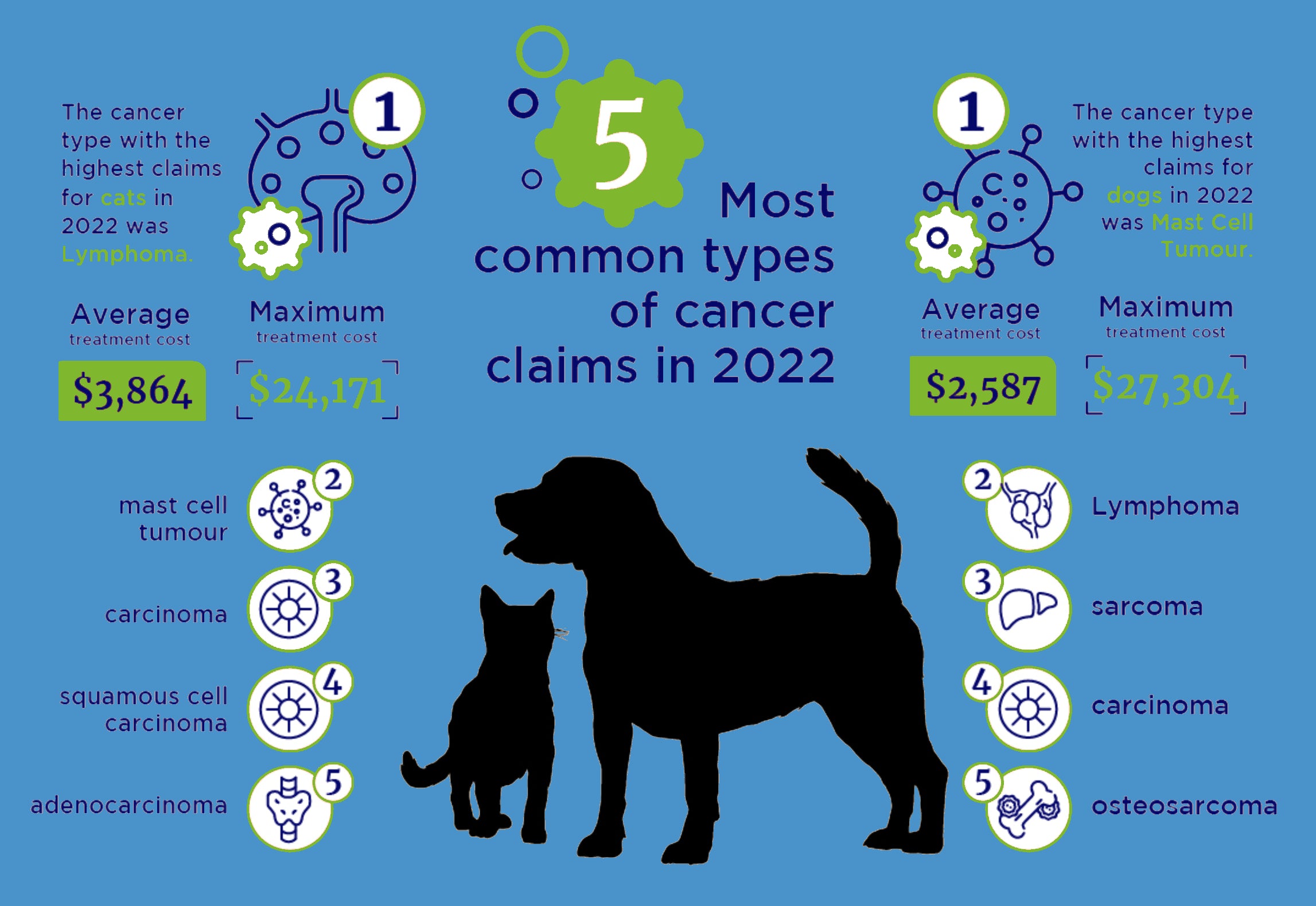 And cancers in cats are fairly similar to cancers in dogs with some of the most common cancers being lymphoma, mast cell tumors, carcinomas squamous cell carcinoma, mammary tumors and adenocarcinoma. In the following graphic, the left side is data for cats while the right side is for dogs.